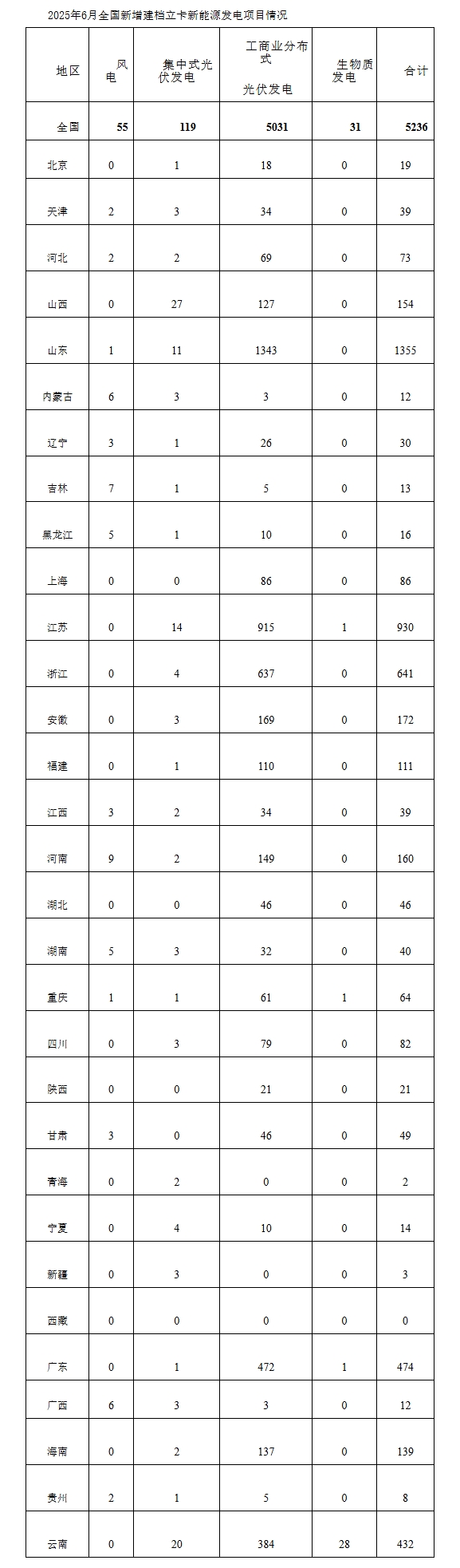 据国家能源局网站消息,国家能源局发布《关于2025年6月全国新增建档立卡新能源发电(不含户用光伏)项目情况的公告》。2025年6月,全国新增建档立卡新能源发电(不含户用光伏)项目共5236个,其中风电项目55个,光伏发电项目5150个(集中式光伏发电项目119个,工商业分布式光伏发电项目5031个),生物质发电项目31个。