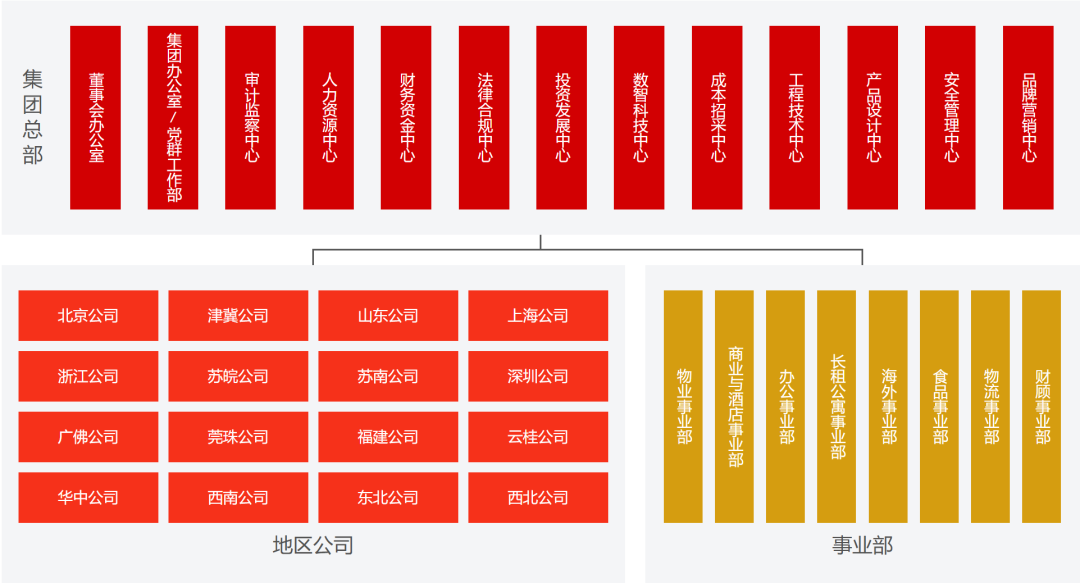 具体来看,在新的组织架构中,集团总部由董事会办公室、集团办公室/党群工作部和投资发展中心、审计监察中心等13个职能部门组成;事业部包含了物业、商业与酒店、长租公寓、物流等八大多元化业务。