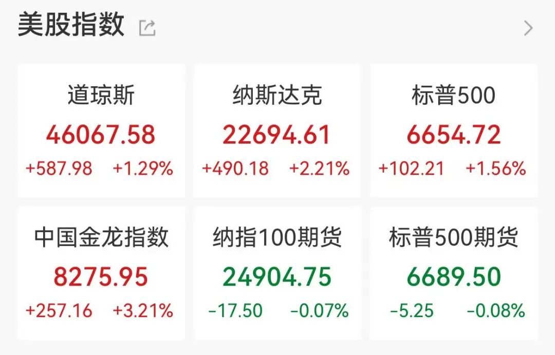当地时间10月13日(周一),美股三大指数收高。截至收盘,道指涨587.98点,涨幅为1.29%,报46067.58点;纳指涨490.18点,涨幅为2.21%,报22694.61点;标普500指数涨102.21点,涨幅为1.56%,报6654.72点。