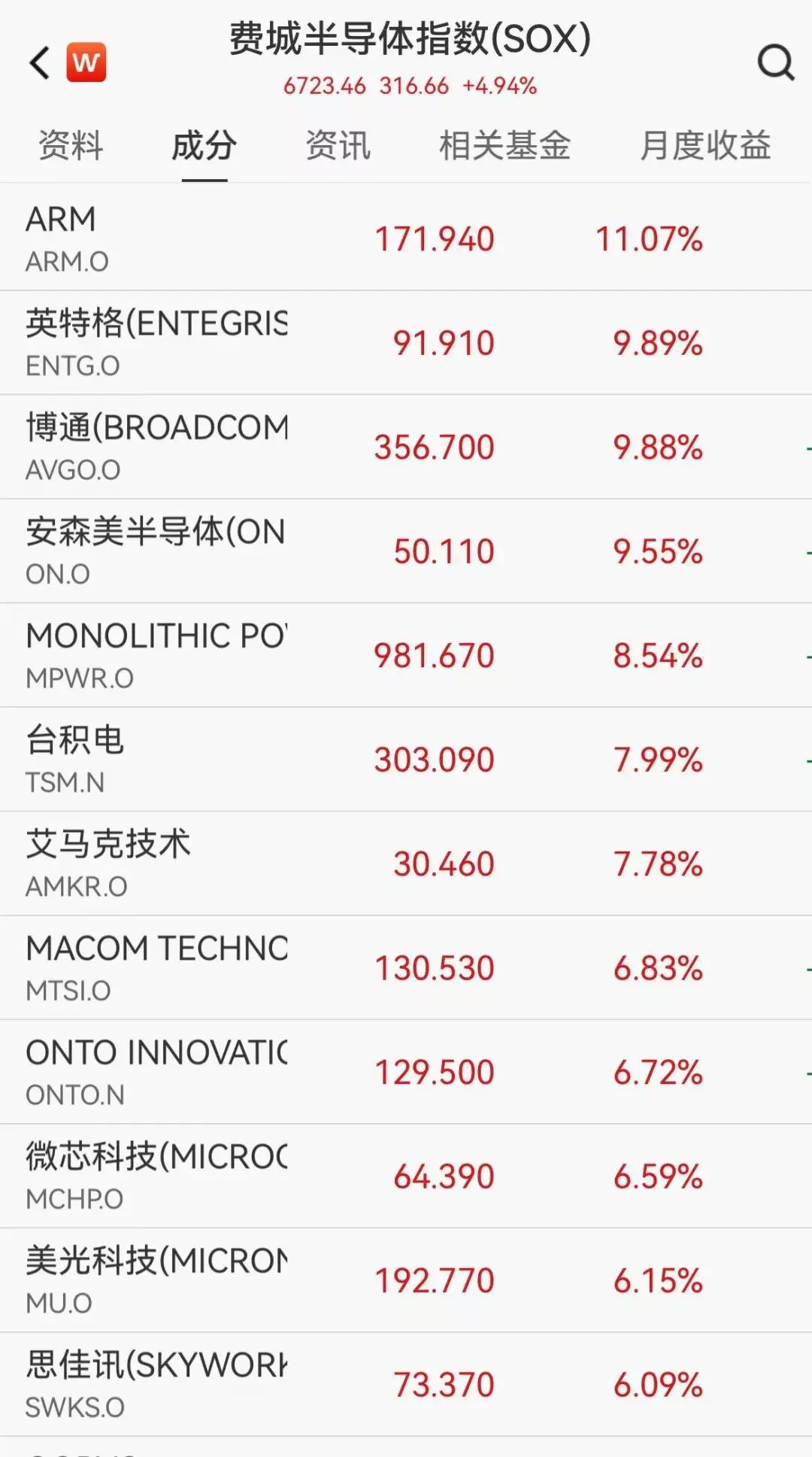 芯片板块全线爆发,费城半导体指数大涨近5%。具体个股方面,ARM涨超11%,博通、英特格涨近10%,安森美半导体涨超9%,台积电涨近8%,美光科技涨超6%,高通、阿斯麦涨超5%,英伟达、英特尔涨超2%,AMD小幅上涨。