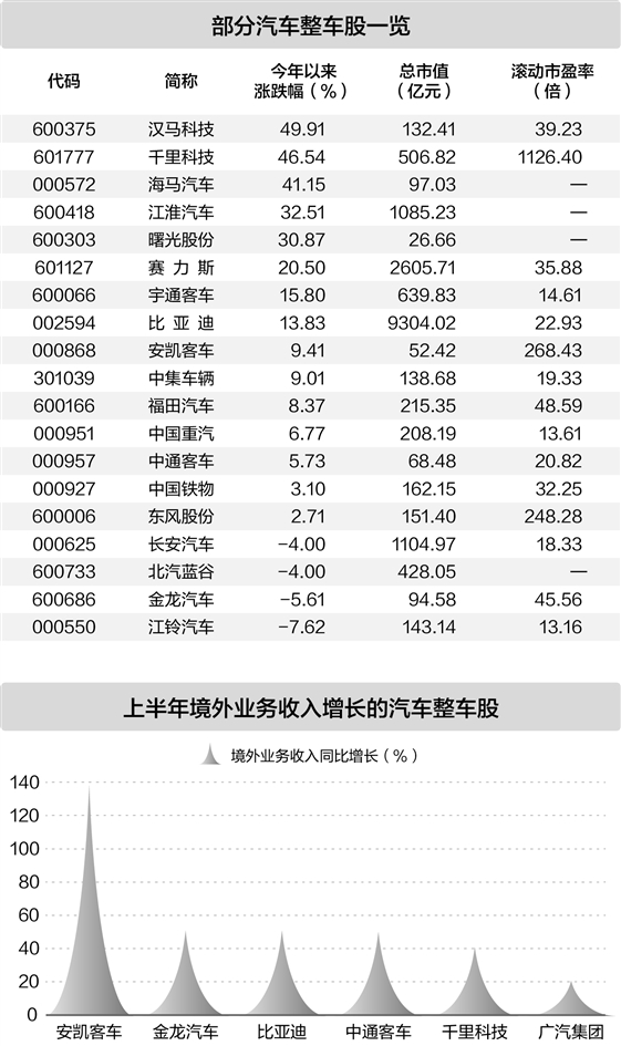 据证券时报·数据宝统计,2025年以来,汉马科技、千里科技、海马汽车和江淮汽车等汽车整车股涨幅居前,均超过30%,分别为49.91%、46.54%、41.15%和32.51%。
