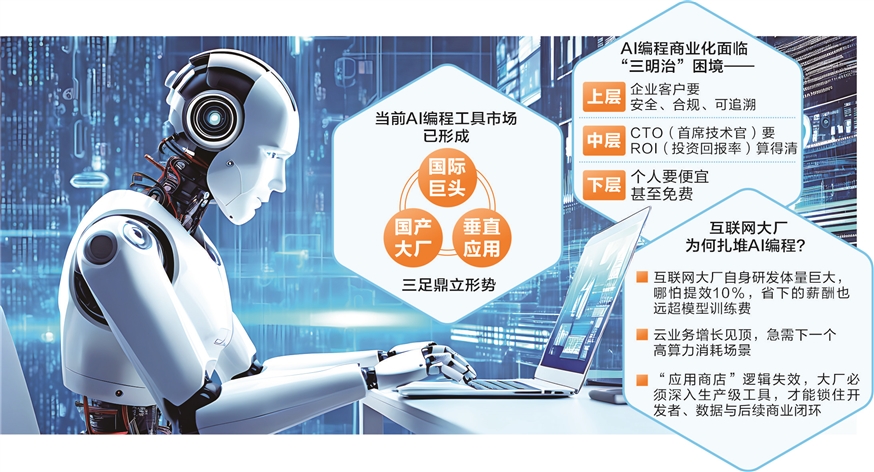 全球著名咨询公司的商品战略顾问总监潘俊向记者表示,AI编程是提升开发效率的关键路径,通过自动化代码生成、调试等环节,能大幅缩短产品开发周期,助力企业降本增效。此外,随着AI技术成熟,编程作为高频应用场景,成为大厂抢占技术高地和生态话语权的战略领域,布局AI工具有助于构建开发者生态,增强平台黏性。